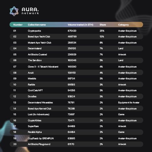 To shed light on the NFT market, we study the top 20 NFT collections by trading volume on OpenSea. We categorize collections into five types: Avatar-like pictures, Artwork, Games, Equipment for Avatar, and Land. While there are thousands of collections in OpenSea at the time of this writing (15th April 2022). We pick up these 20 collections and attempt to find the general patterns of why they are popular. Our analysis ignores the time dimension (that is, some collections are released earlier than others, and some historical values are embedded in them).