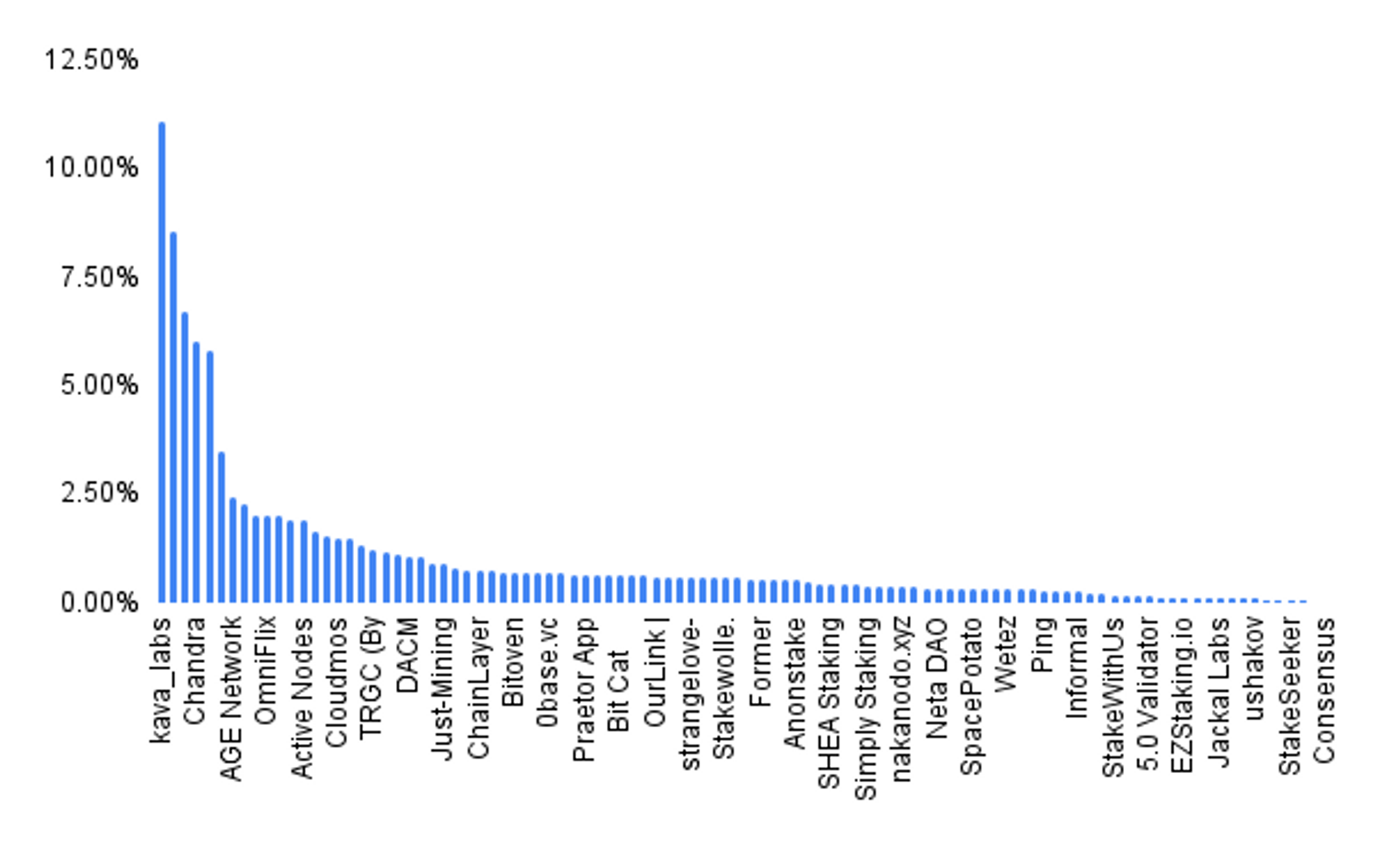 Hệ số Nakamoto của Akash là 5, vì nó cần 5 validator hàng đầu để vượt qua ngưỡng quyền biểu quyết 33%. Biểu đồ dưới đây sẽ giúp bạn có một cái nhìn trực quan hơn. Validator lớn nhất của Akash là Kava Labs, với 16.7 triệu AKT (khoảng 4.1 triệu USD)