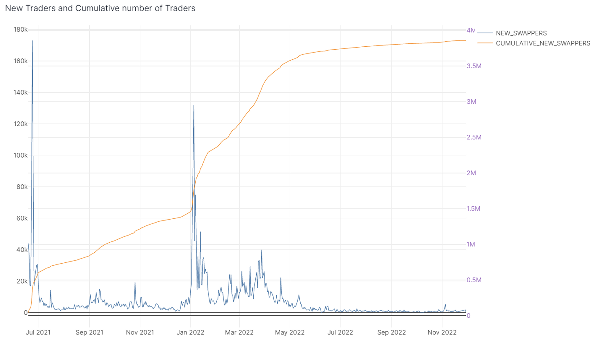 Next, we will look at the trading activity of AKT on Osmosis. The trading volume fell dramatically in May, which coincided with the depeg of UST, and has consistently stayed within the low range of $20K - $200K. Looking at the number of new AKT traders and cumulative number, we can see that a large spike also occurred around January 2022, with a smaller uptrend in September, October 2021 and March - April 2022.