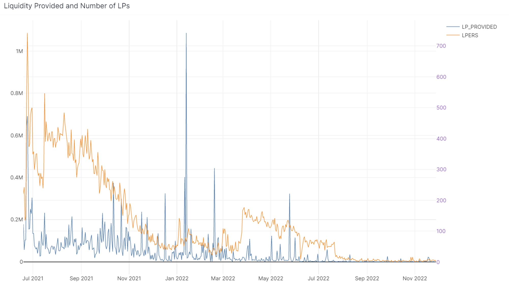 Similarly, Liquidity Provider (LP) supplied in AKT correlate with trading activity on Osmosis, although the number of LPs has been in a noticeable downtrend since June 2021.
