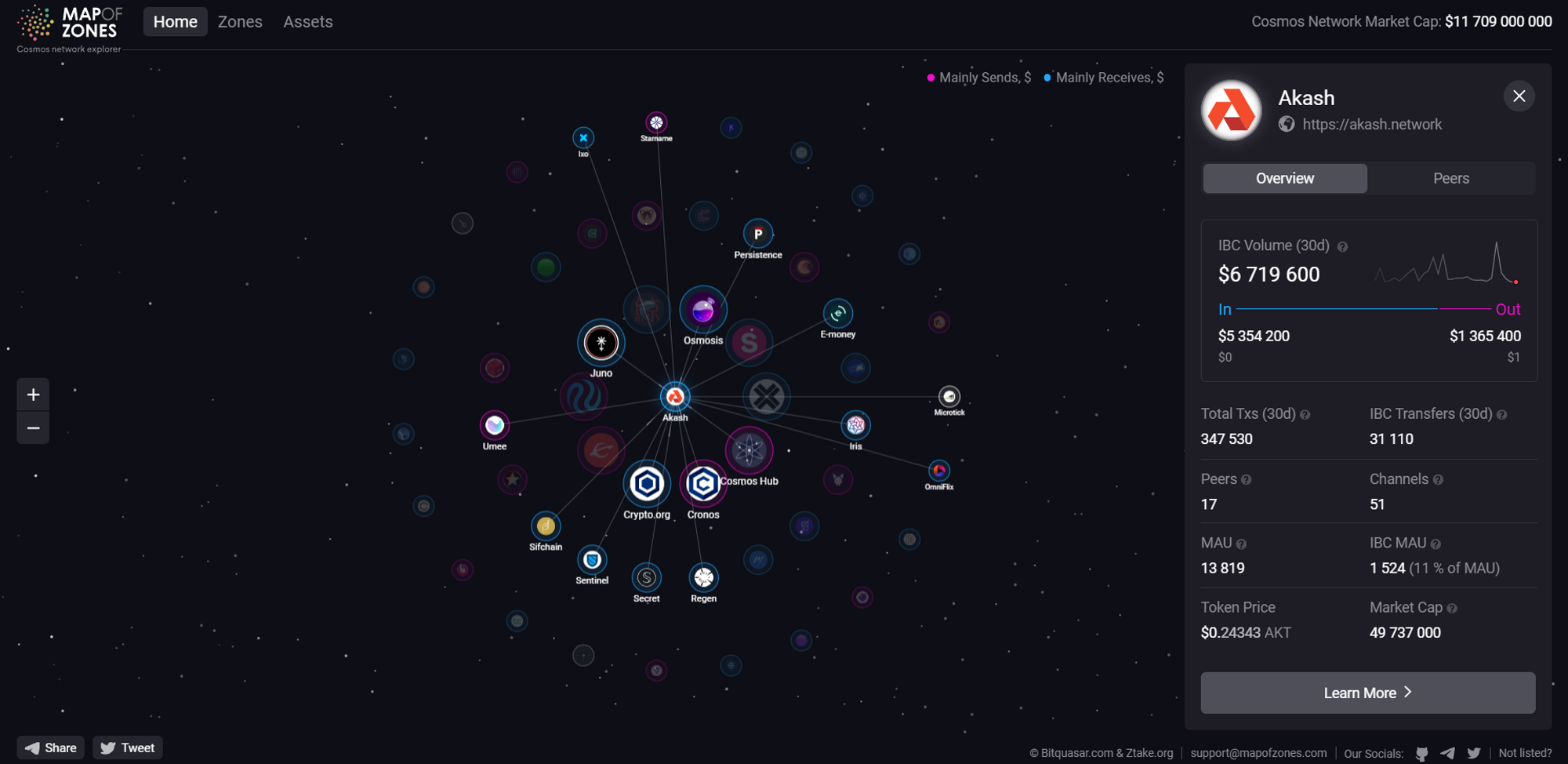 The activity between Akash and other Cosmos Zones is also lackluster. Within 30 days, the number of IBC transactions is 31K, at 6.7M in dollar terms, mostly with Osmosis ($6.5M)