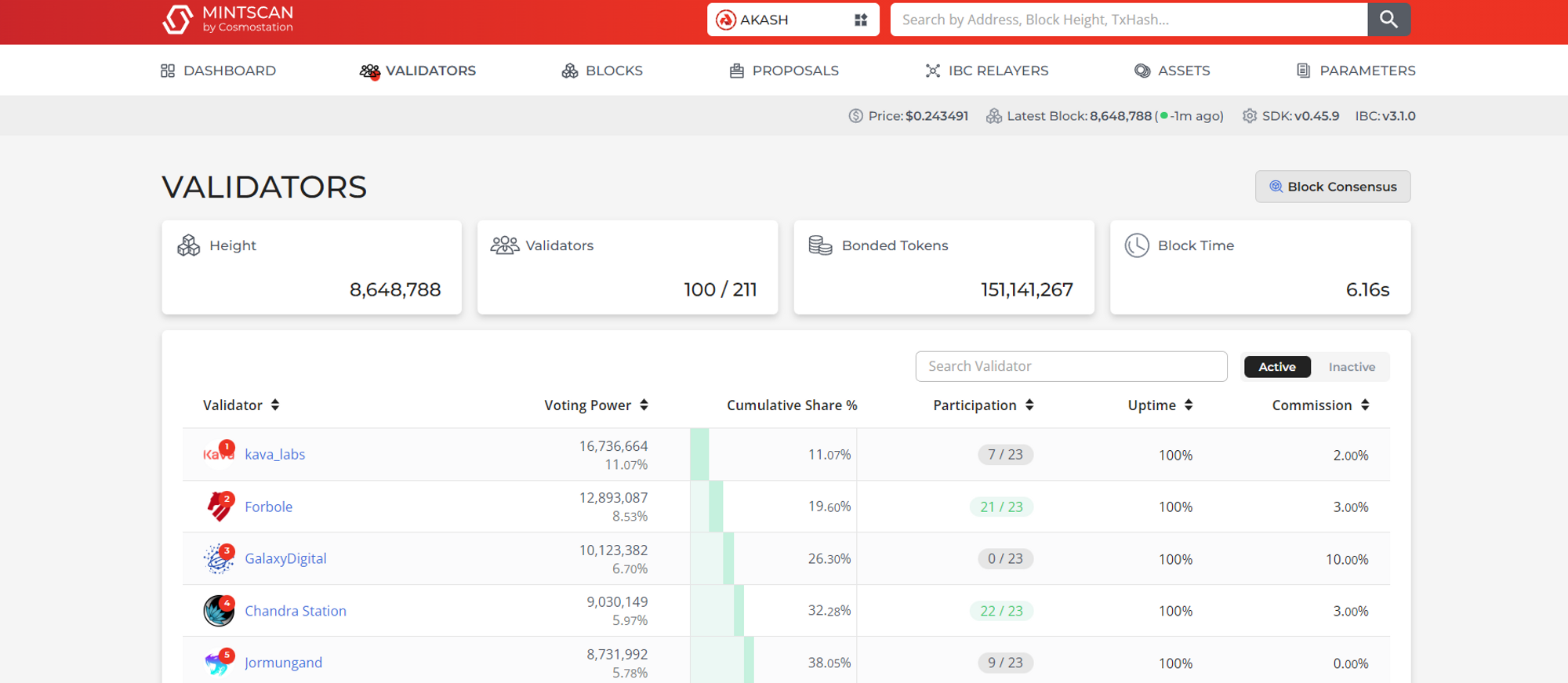 First, let’s take a look at the validator's set of Akash. As most Cosmos Zone uses Proof of Stake, the decentralization and security of the Layer will depend on its validators.