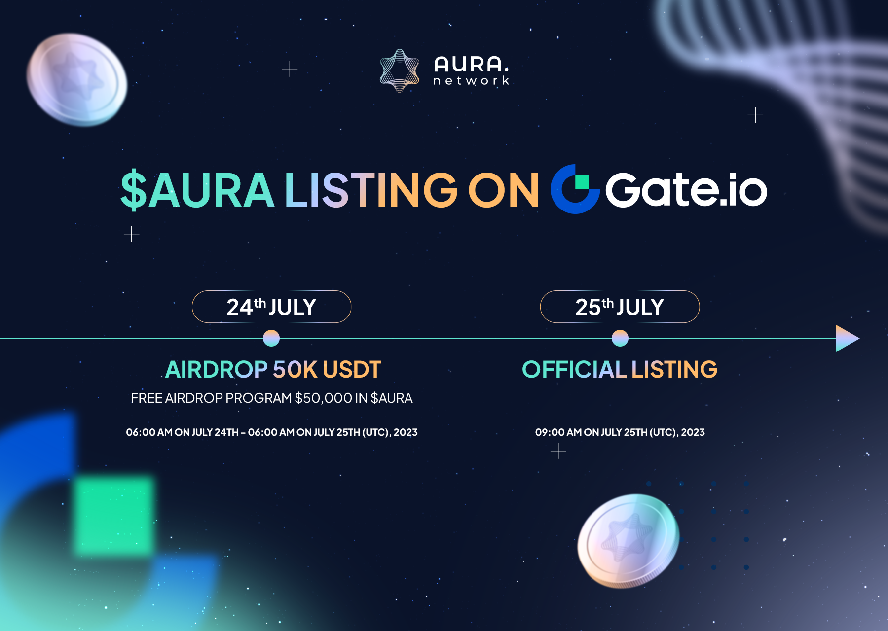 Gate.io Startup will launch its next Free Airdrop Program with Aura Network (AURA), on July 24th, 2023 at 06:00 AM (UTC).