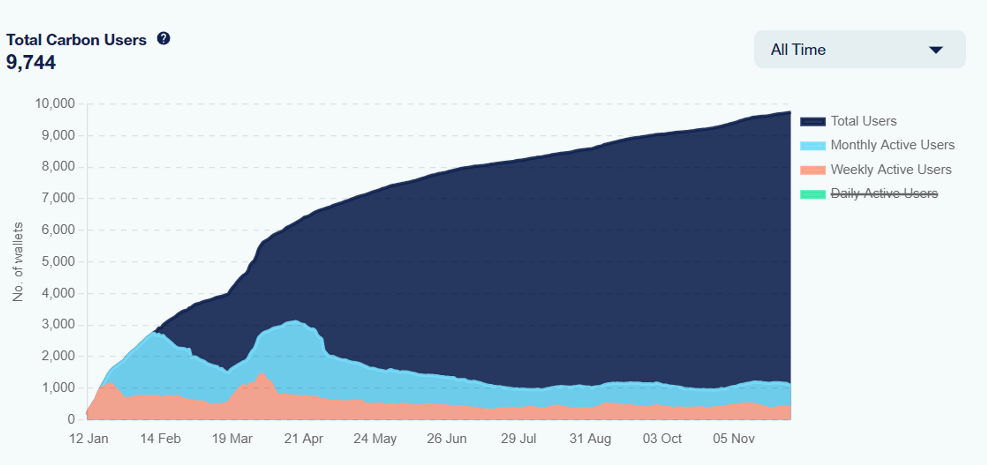 After a brief surge in the weekly number of users in March, it has plateaued around 500 - 600, while the total number almost reaches 10K. Compared that to Osmosis which has a cumulative 2,5 million traders and 10K weekly (though it has substantially dropped since the FTX fallout in November), we can see that Carbon does not have much adoption.