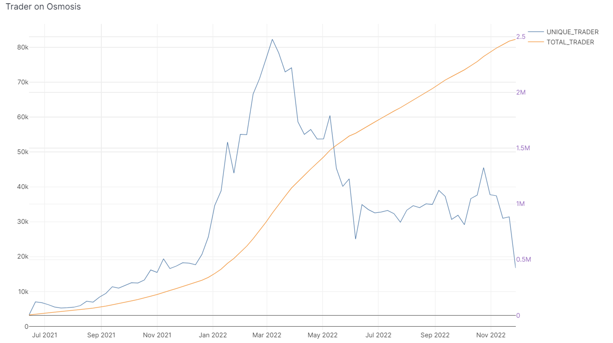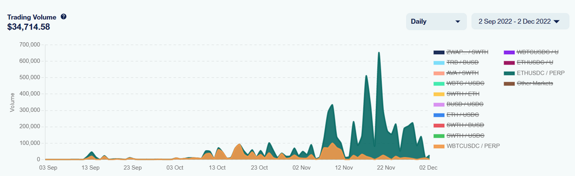 The main advantage Carbon has over Osmosis is that it allows for derivatives trading, yet on-chain data also paints a very bleak picture. The total trading volume for ETH - USDC Perp and WBTC - USDC Perp is just $34,7K. Interestingly, volume picked up from 10 to 22 November, which is not the exception as, after the FTX incidence, there has been a large inflow of money to perp DEX such as GMX, GNS …