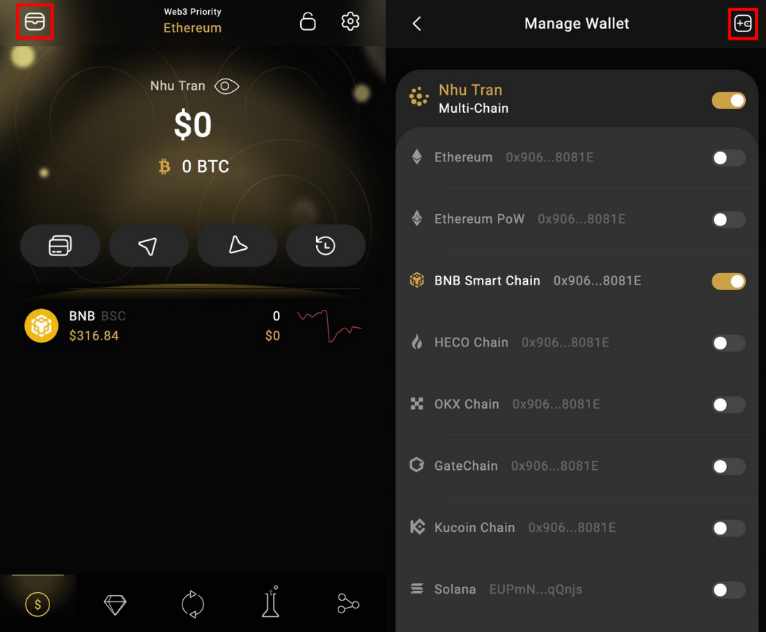 + Step 1: Open the Coin98 extension, click on the wallet icon in the upper left corner. Then, click the add wallet icon in the upper right corner.