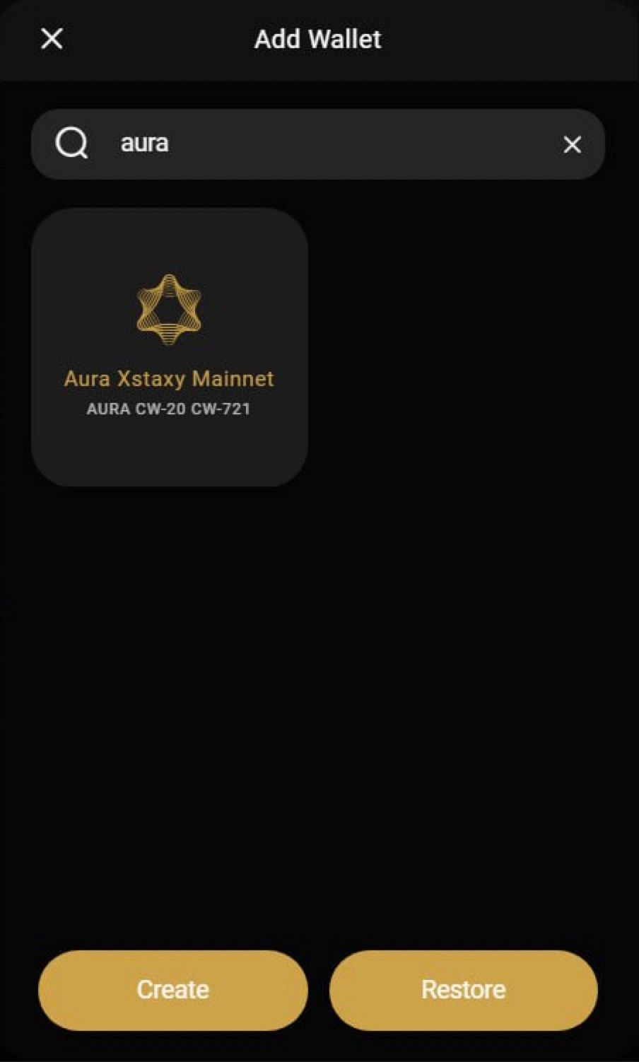 + Step 2: In the add wallet interface, enter “Aura” in the search bar and select “Aura Xstaxy Mainnet”.