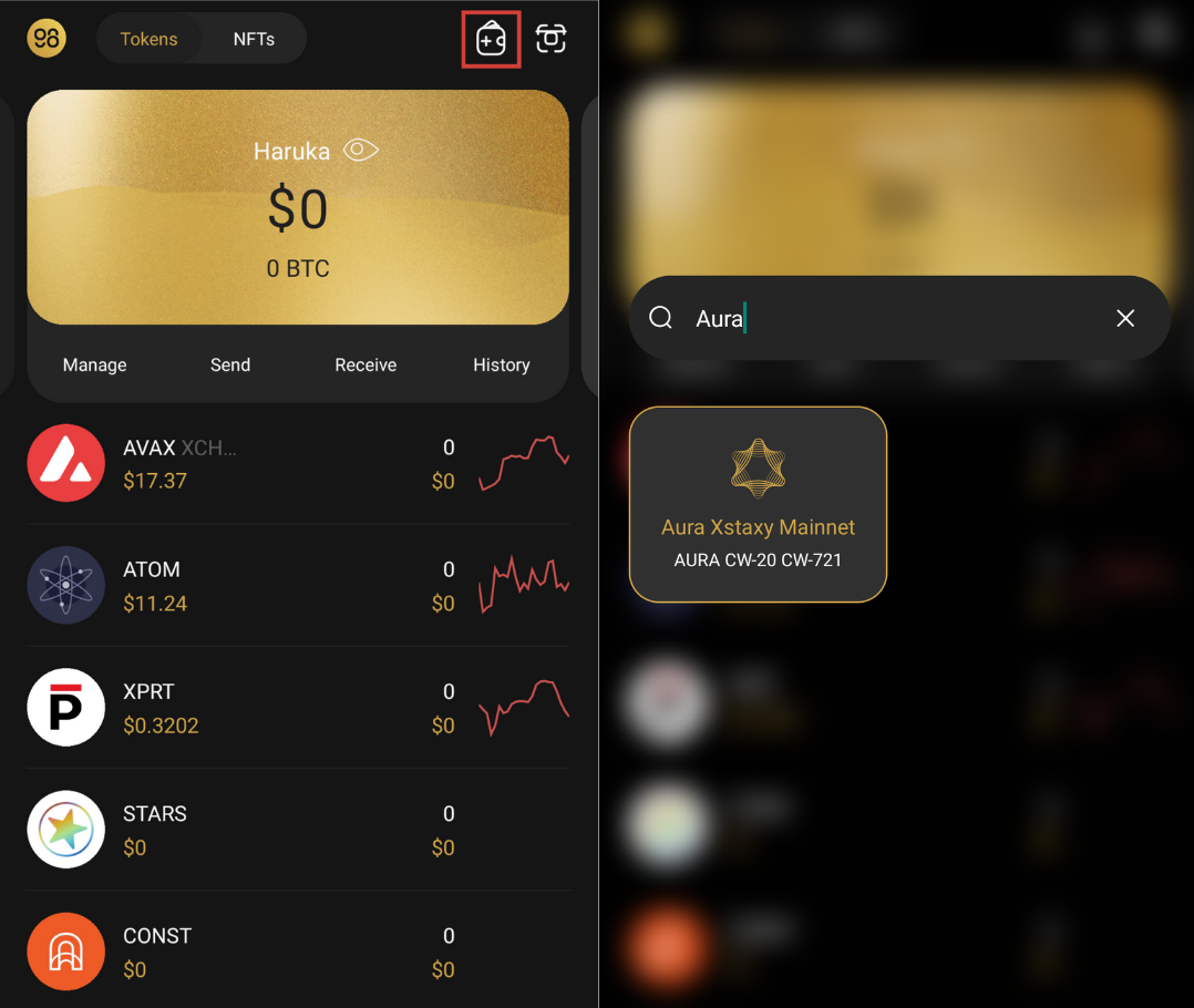 + Step 1: Open Coin98 Super App, choose the Add wallet symbol on the top-right corner. Enter “Aura'' in the search bar and choose Aura Xstaxy Mainnet.
