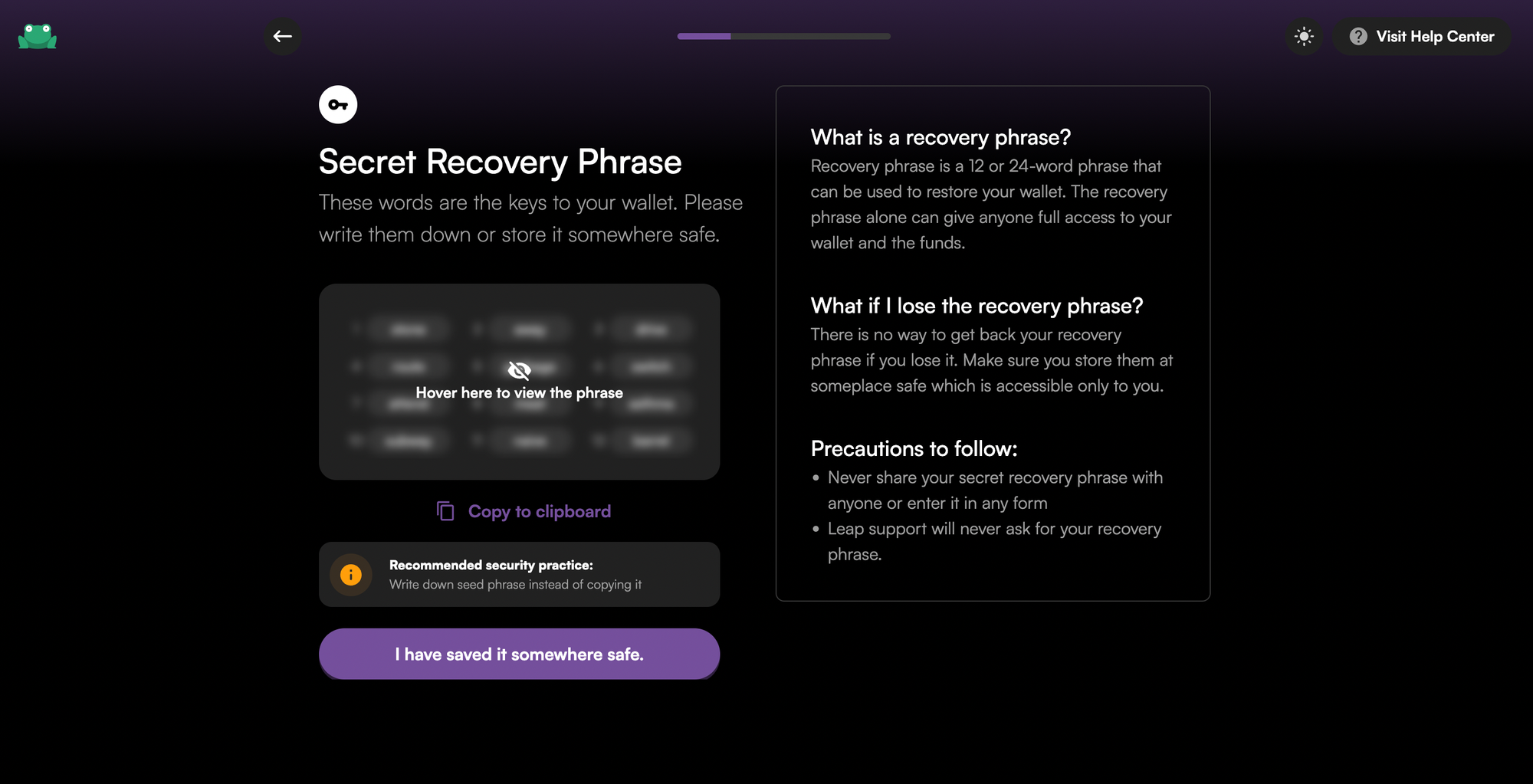 - Bước 1: Chọn Create a new wallet nếu như bạn chưa có ví Leap. Một dãy “kí tự bảo mật” sẽ được cấp riêng cho ví của bạn, cần lưu trữ “ký tự bảo mật" ở nơi an toàn.