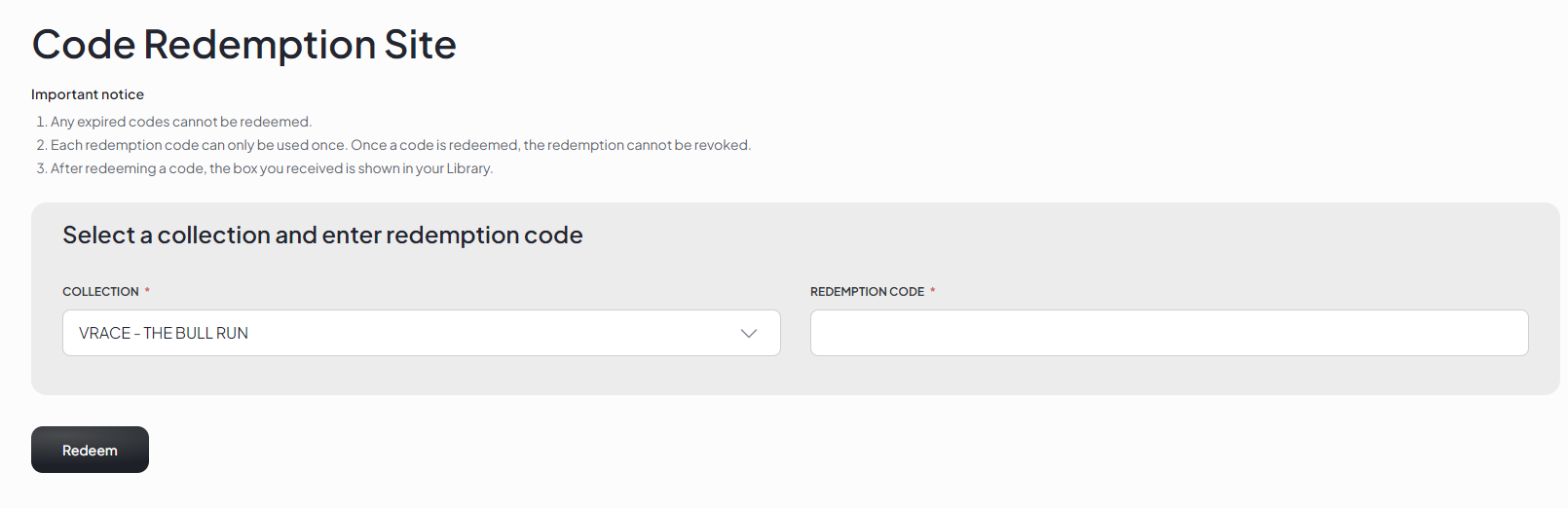 Step 3: At the Code Redemption Site, select NFT Collection and enter your code (via collection from events or contests).