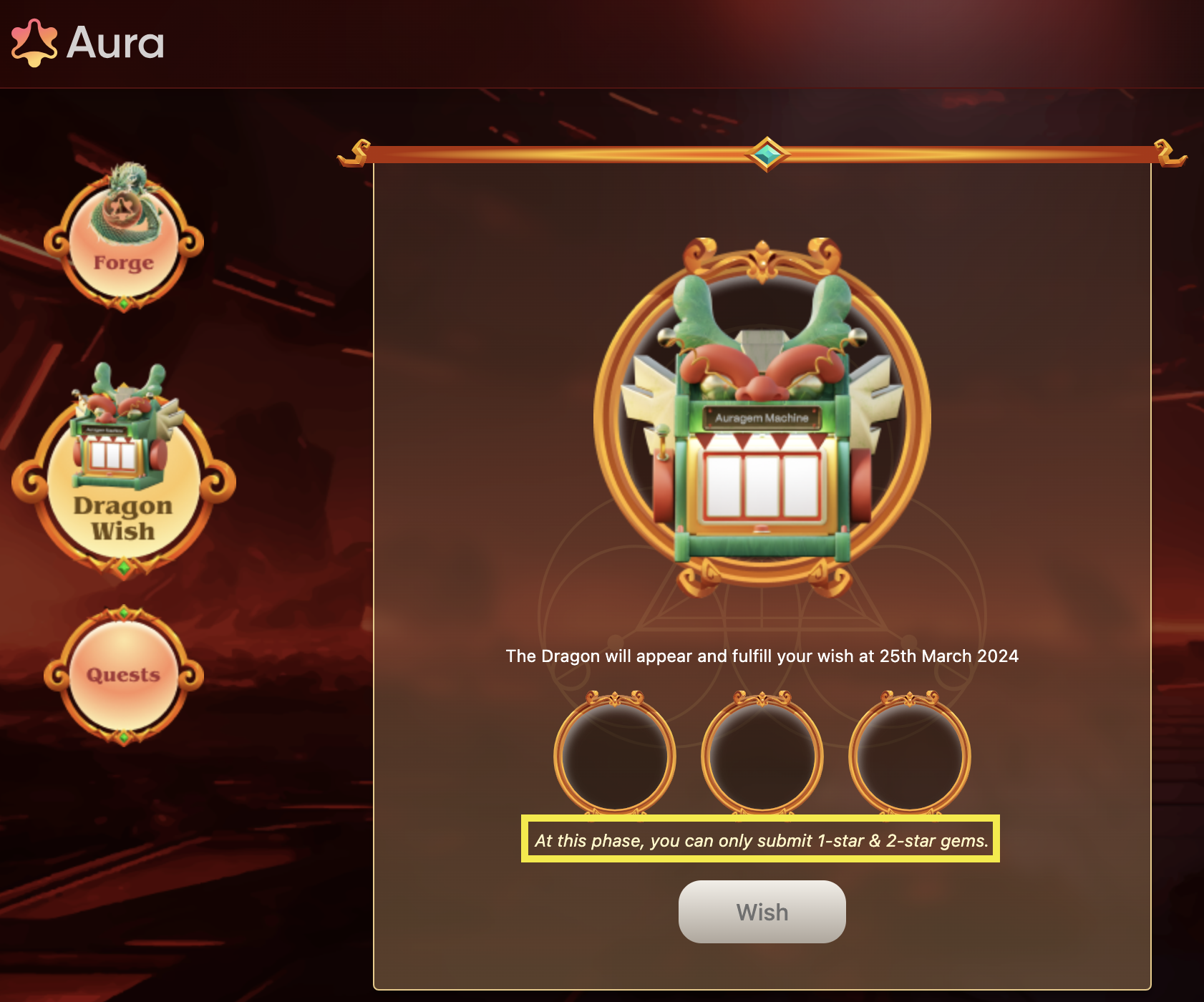 Aura Network's Gem Forge: Quest for the Dragon's Wish has officially begun! Join the hunt for the Dragon's wish and embark on an epic journey. Dear warriors, forge your gems and make your wishes. Legendary rewards await the chosen one.