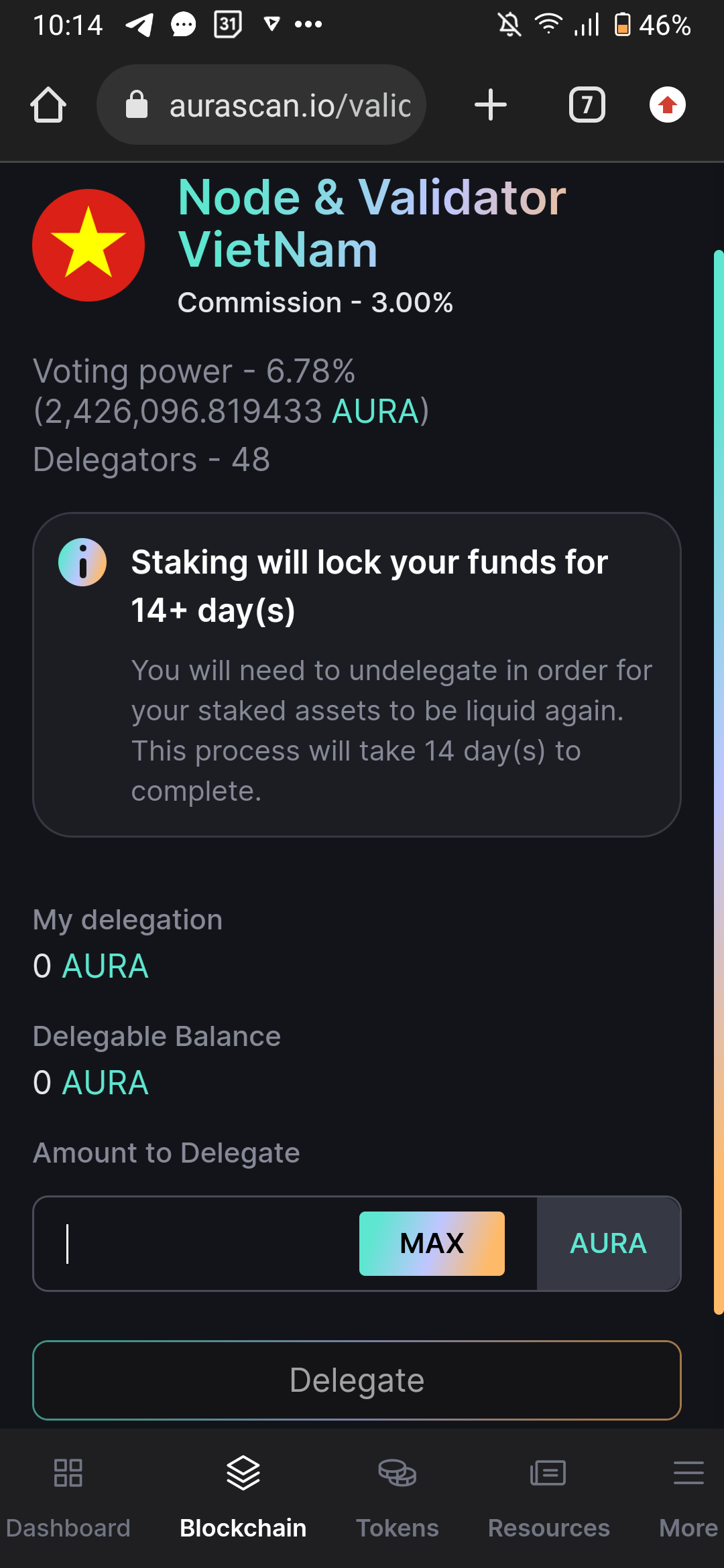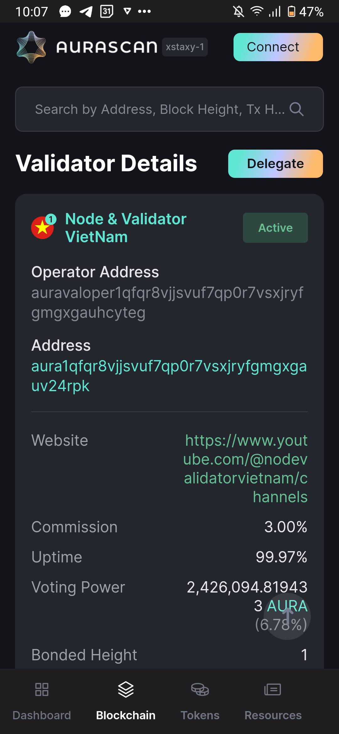 Once you have selected a validator you trust, delegate your AURA through delegation transactions. Click on Delegate, connect your wallet to AuraScan and delegate.
